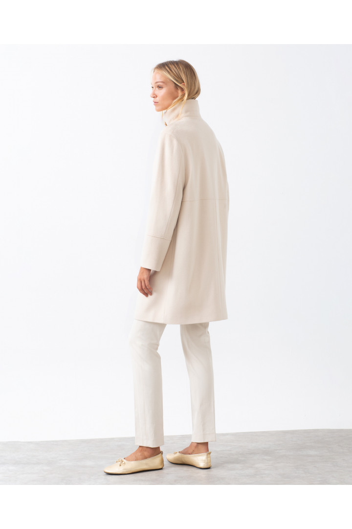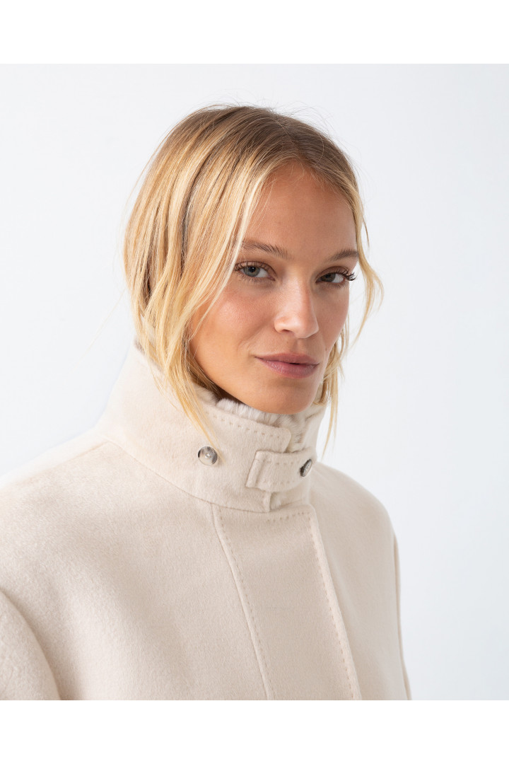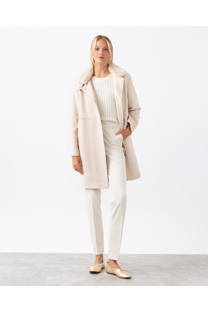 Abrigo ABES de media largada con pieza de peletería desacoplable en cuello. Cierre con snaps en delantero y bolsillos verticales en vivo. Modelo: altura 178 cm. - Talla 38
