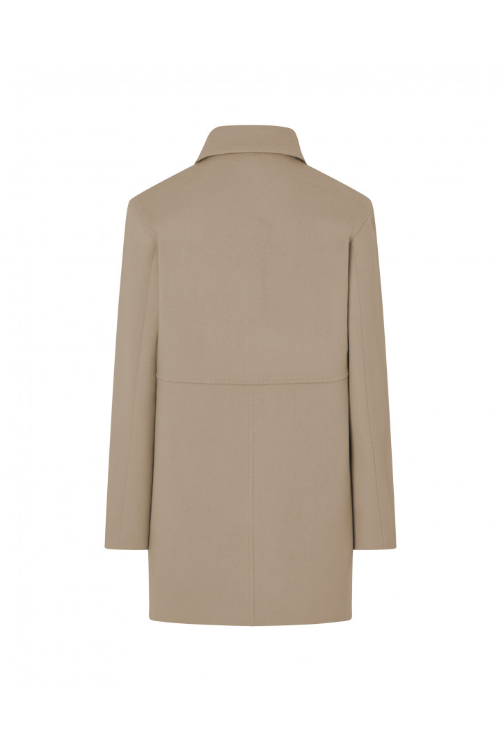 Chaquetón CHENIS beige con cortes en delantero con bolsillos de tapeta veticales. Cuello camisero. Abrochado con botones y adorno de pespunte puntet a tono.
