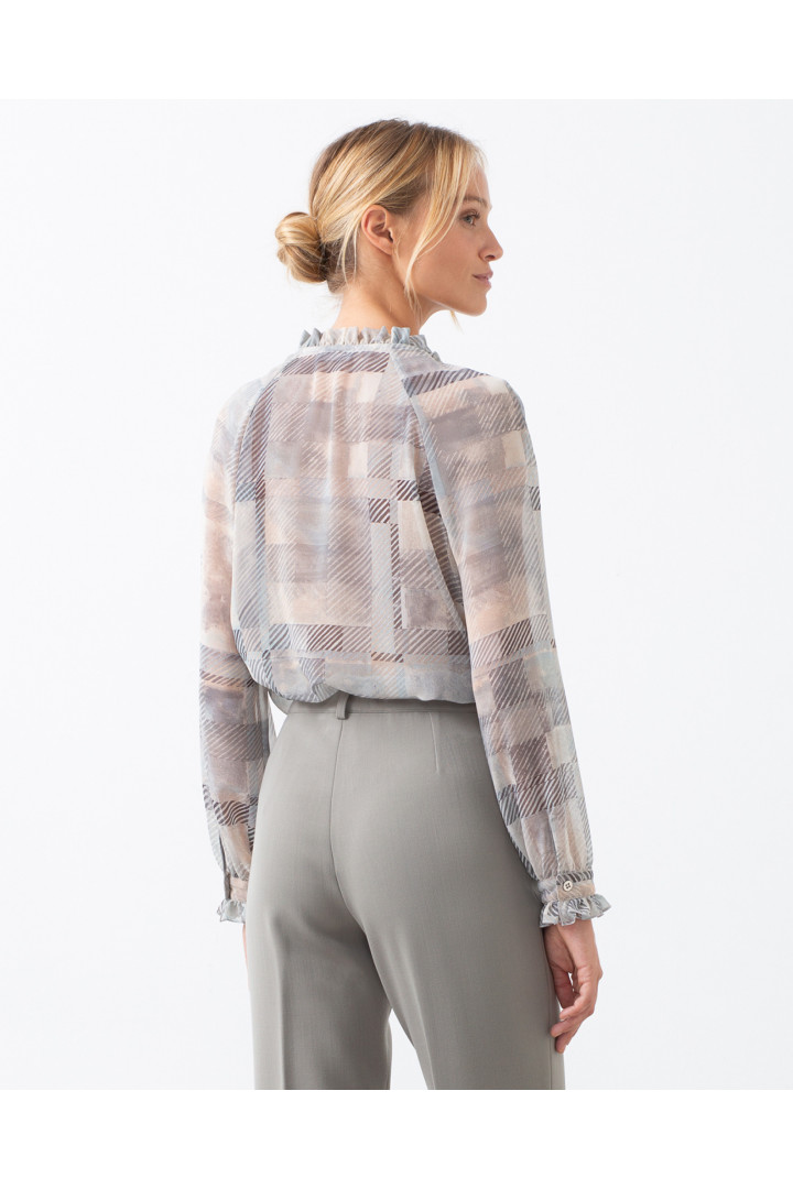 Blusón CIBET manga ranglan, cuello camisero con volante y spaghetti del mismo tejido en escote para abrochar. Estampado cuadros grandes en tonos grises, azulados y rosados.Modelo: altura 178 cm. - Talla 38