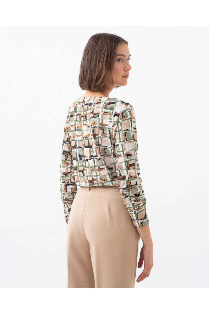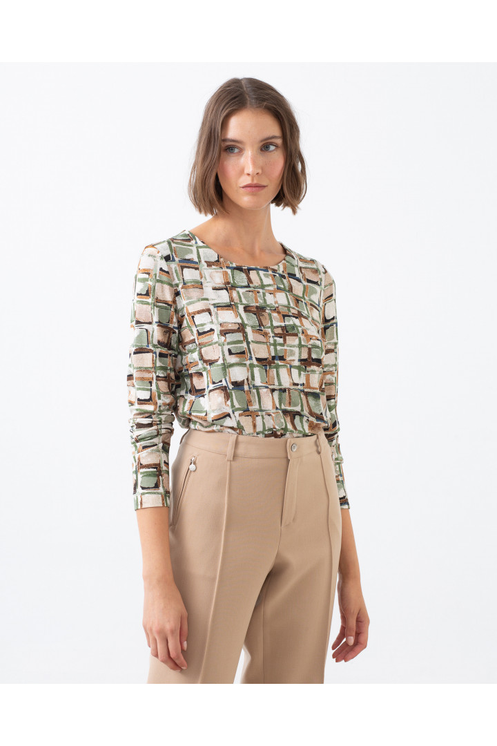 Camiseta TIBLIX manga larga con cuello redondo, estampado cuadros en tonos marrones y verdes.Modelo: altura 178 cm. - Talla 38