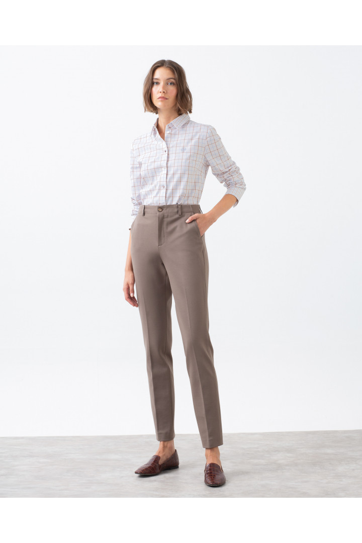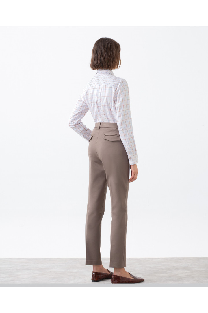 Pantalón POK marrón recto de tiro alto y con cinturilla, tejido de punto roma. Bolsillos diagonales. Bajo de 17 cm de ancho. Modelo: altura 178 cm. - Talla 38