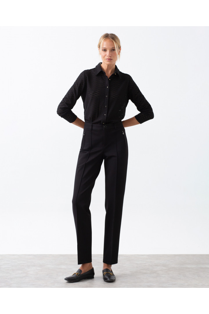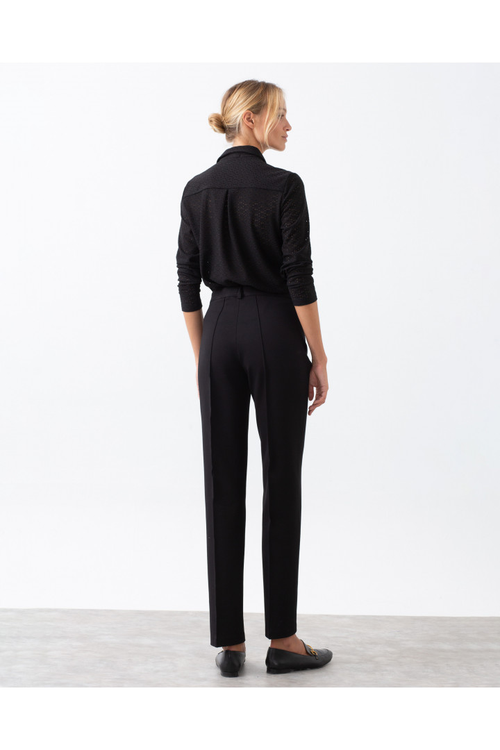 Pantalón PAKITO de punto roma, recto de tiro alto con nervio delantero y bolsillos con cremallera. Cinturilla con pasadores para cinturón. Bajo de 19 cm.
