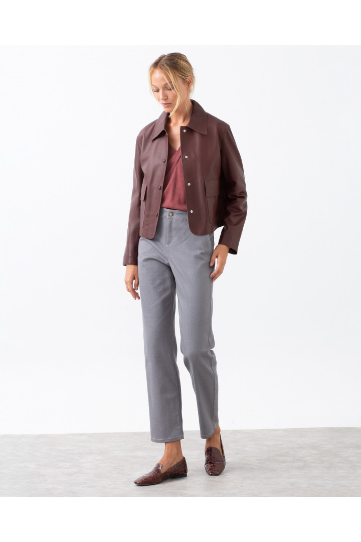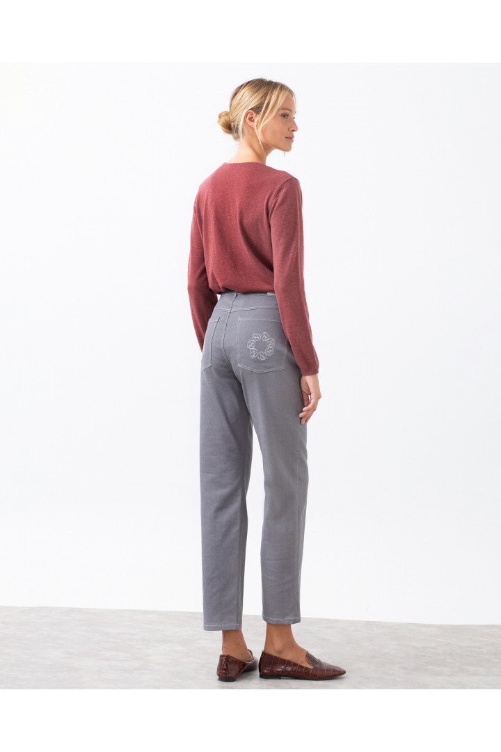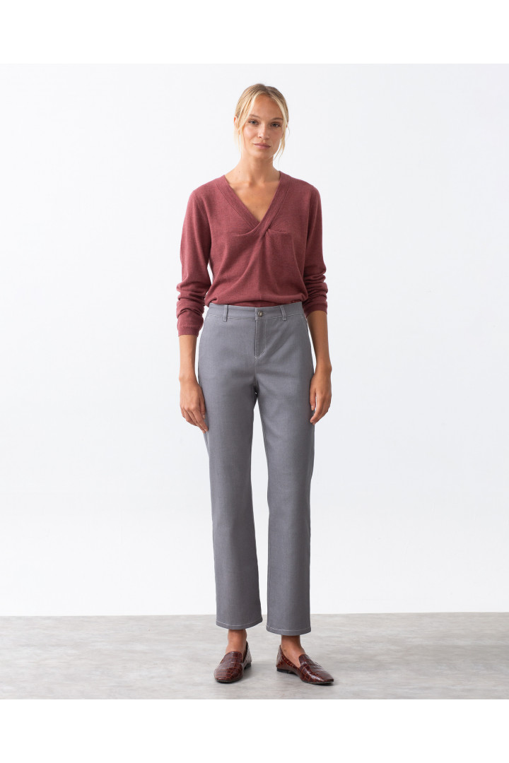 Pantalón PILE chino,tobillero tiro alto. Bolsillo frances. Detalle de pespuntes a contraste. Cierre cremallera y boton. Largo 96cm ancho 15 cm 96
