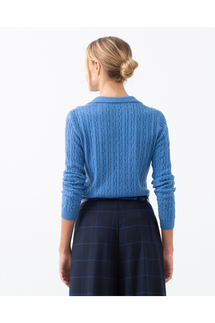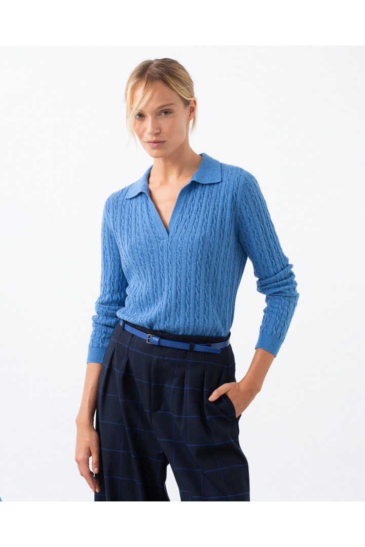 Pullover TIRSA azul con cuello tipo polo. Acabado punto canalé con puños, cuello y bajos. Modelo: altura 178 cm. - Talla 38
