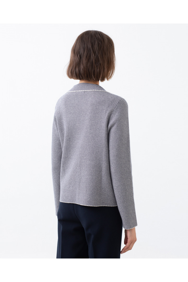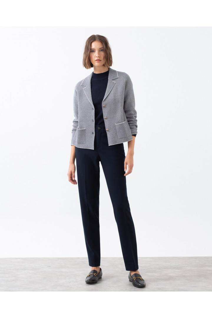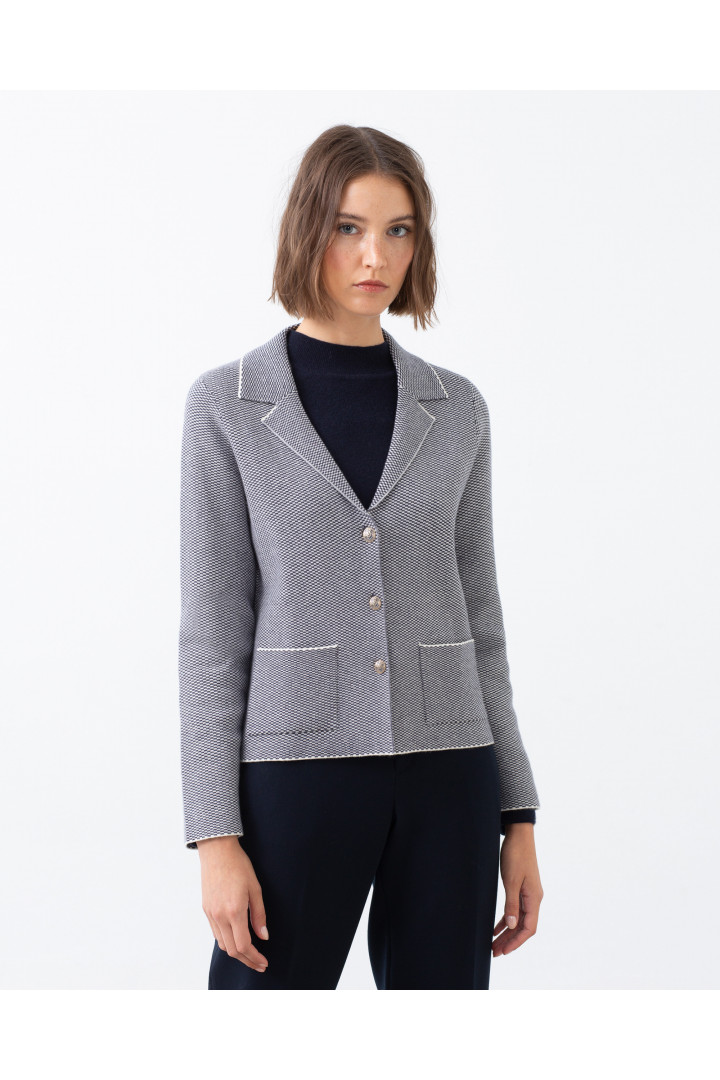 Chaqueta corta TULAN azul marino y blanco cuello solapa bolsillos de plastrón. Trama en espiga Modelo: altura 178 cm. - Talla 38